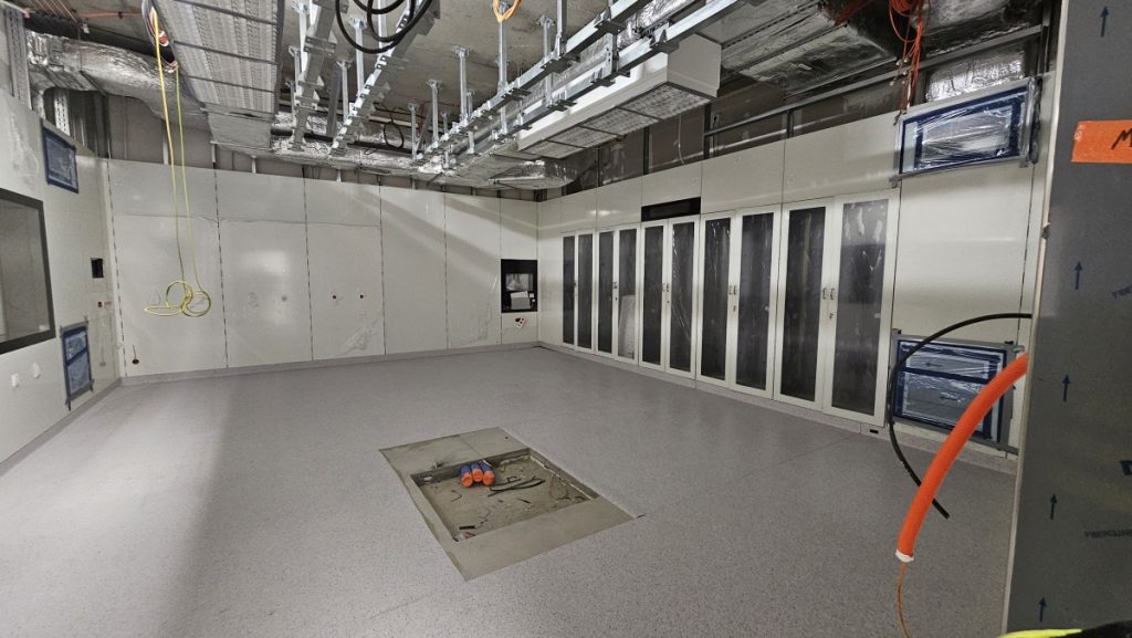 W Module 4 realizowano podobny zakres prac wykończeniowych. Kontynuowano malowanie, montaż wykładzin winylowych i drzwi stalowych nierdzewnych, a także rozpoczęto zabudowy sal diagnostyki obrazowej z paneli szklanych. W łącznikach trwały prace przy płytach odbojowych i tapetowaniu. Zamontowano elementy wyposażenia sanitarnego, a także rozpoczęto montaż mebli. Zespół elektryków kontynuował montaż oświetlenia i systemów bezpieczeństwa, a także prace przy sieci teletechnicznej – ustawiono szafy LAN i wykonano pomiary. W obszarze instalacji sanitarnych prowadzono montaż instalacji centralnego ogrzewania, wentylacji, wody użytkowej, wody lodowej, gazów medycznych oraz poczty pneumatycznej. Zakończono montaż grzejników płytowych, trwały prace przy montażu belek chłodzących i klimakonwektorów, a także płukanie instalacji. Rozpoczęto również rozruch instalacji klimatyzacji.