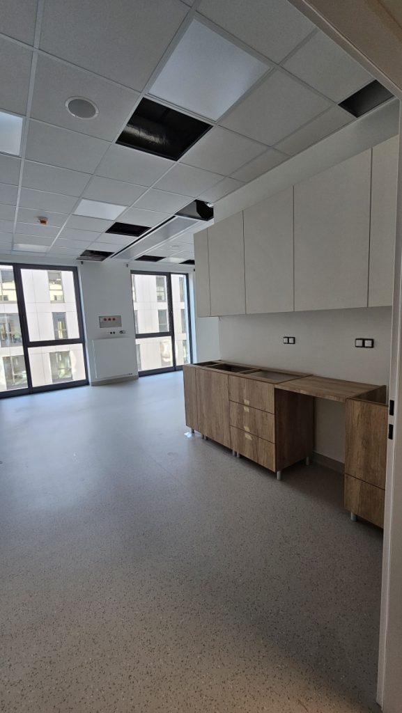 W Module 3 trwały zaawansowane prace wykończeniowe. Kontynuowano drugie malowanie pomieszczeń, montaż wykładzin winylowych na łącznikach oraz instalację sufitów podwieszanych. Postępowały również prace związane z montażem drzwi stalowych nierdzewnych, płyt odbojowych i tapet w łącznikach. W łazienkach i umywalniach zamontowano lustra, pochwyty, siedziska oraz drążki prysznicowe. Rozpoczęto montaż zabudów meblowych, które sukcesywnie pojawiają się w pomieszczeniach użytkowych. W zakresie instalacji elektrycznych prowadzono montaż opraw oświetleniowych oraz oświetlenia ewakuacyjnego, a także elementów końcowych systemów SSP i DSO. Zakończono wykonanie i pomiary sieci LAN wraz z montażem szaf. Prace sanitarne obejmowały montaż instalacji kanalizacyjnej, centralnego ogrzewania, wentylacji, wody użytkowej, gazów medycznych oraz poczty pneumatycznej. Zakończono montaż grzejników, a w dalszym ciągu prowadzono prace przy montażu belek chłodzących i klimakonwektorów. Wykonywano płukanie instalacji grzewczo-chłodniczych oraz rozpoczęto rozruch systemów wentylacji i klimatyzacji.