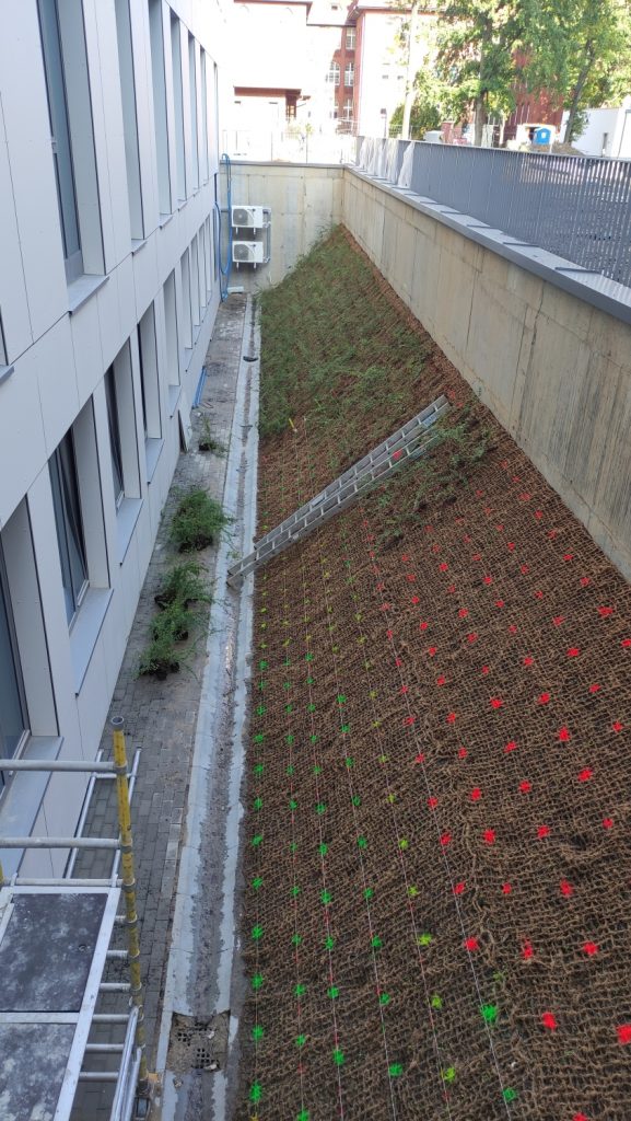 Tym czasem w Module 2a wraz z łącznikiem 2b i 3b ukończone zostały prace związane z układaniem okablowania zasilającego oświetlenie awaryjne. Niedługo zostanie również zakończone układanie tras kablowych, w tym okablowania stropowego zaopatrującego oświetlenie sufitowe. Synchronicznie do Modułu 1 trwa sprawdzanie i płukanie instalacji centralnego ogrzewania, ciepła technologicznego i wody lodowej. Na ukończeniu jest również proces układania paneli fotowoltaicznych na dachu budynku. W tym samym czasie trwa proces rozmieszczania światłowodów w obrębie głównej serwerowni oraz specjalistycznej instalacji służącej do gaszenia gazem w obrębie serwerowni. Nie ustają także pracę związane z białym montażem oraz instalacjami sanitarnymi na poszczególnych poziomach. Rozpoczęto również instalowanie nawiewników i wywiewników, klimatokonweterów oraz belek chłodzących. W obrębie terenu szpitalu rozpoczęto prace nad terenami zielonymi, w tym humusowanie terenu oraz sadzenie pierwszych krzewów. Zamontowano również pierwsze stojaki rowerowe. W dalszym ciągu trwają prace związane z podbudową pod drogi po wschodniej stronie budynku. Dodatkowo nadal trwa układanie kanalizacji deszczowej oraz sanitarnej. Nie ustają również prace instalacyjne związane z budową instalacji wodociągowej na działce. Dalsza rozbudowa sieci kablowej pozwoli niedługo na ukończenie takich elementów, jak oświetlenie całego terenu parkingu oraz ukończenie instalacji agregatowej. W tym samym czasie ukończono montaż sieci zasilania średniego napięcia, które po przeprowadzeniu odpowiednich pomiarów pozwoliły na podanie na nie napięcia. Realizowany jest także montaż instalacji tlenowej i CO2 w budynku tlenowni.